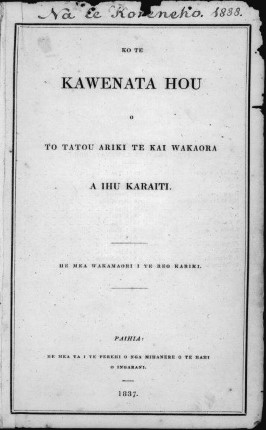 Colenso, W. Ko Tetahi Wahanga o te Kawenata Hou o to Tatou Ariki te Kai Wakaora a Ihu Karaiti: He Mea WakaMāori i te Reo Kariki; New Testament. Paihia: He mea ta i te Perehi o nga Mihanere o te Hahi o Ingarani, Paihia Press, 1837.