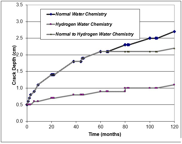 An example of the deterministic prediction of damage due to stress corrosion cracking (SCC) in reactor piping is shown in Figure 1, in which the depth of a crack in Type 304 stainless steel in the core shroud of a Boiling Water (Nuclear) Reactor is displayed as a function of various operating protocols as might be chosen by the reactor operator. Thus, “normal water chemistry” is the standard operating protocol for a BWR in which no attempt is made to modify the redox properties of the coolant (water at 288 oC) so as to reduce the driving force of the crack, which is the corrosion potential of the steel. Under this protocol the crack grows by about 2.2 cm over the operating period of ten years. The addition of hydrogen to the coolant water in the Hydrogen Water Chemistry (HWC) operating protocol that results in a reduction in the driving force for crack propagation and hence in the crack propagation rate, was originally developed in Sweden as a means of combatting SCC in the coolant circuits of BWRs. As seen, if HWC is implemented at the start of operation, the increase in crack length is reduced to 0.6 cm, which is substantial with significant financial implications for the operator and consumer alike. On the other hand, if HWC is implemented after five years, the crack is predicted to grow by 1.9 cm, which is only moderately better than if HWC had never been implemented at all. The reader will note that this “law of decreasing returns” situation is due to the shape of the crack length vs time correlation, corresponding to a decrease in the crack growth rate as the crack grows.