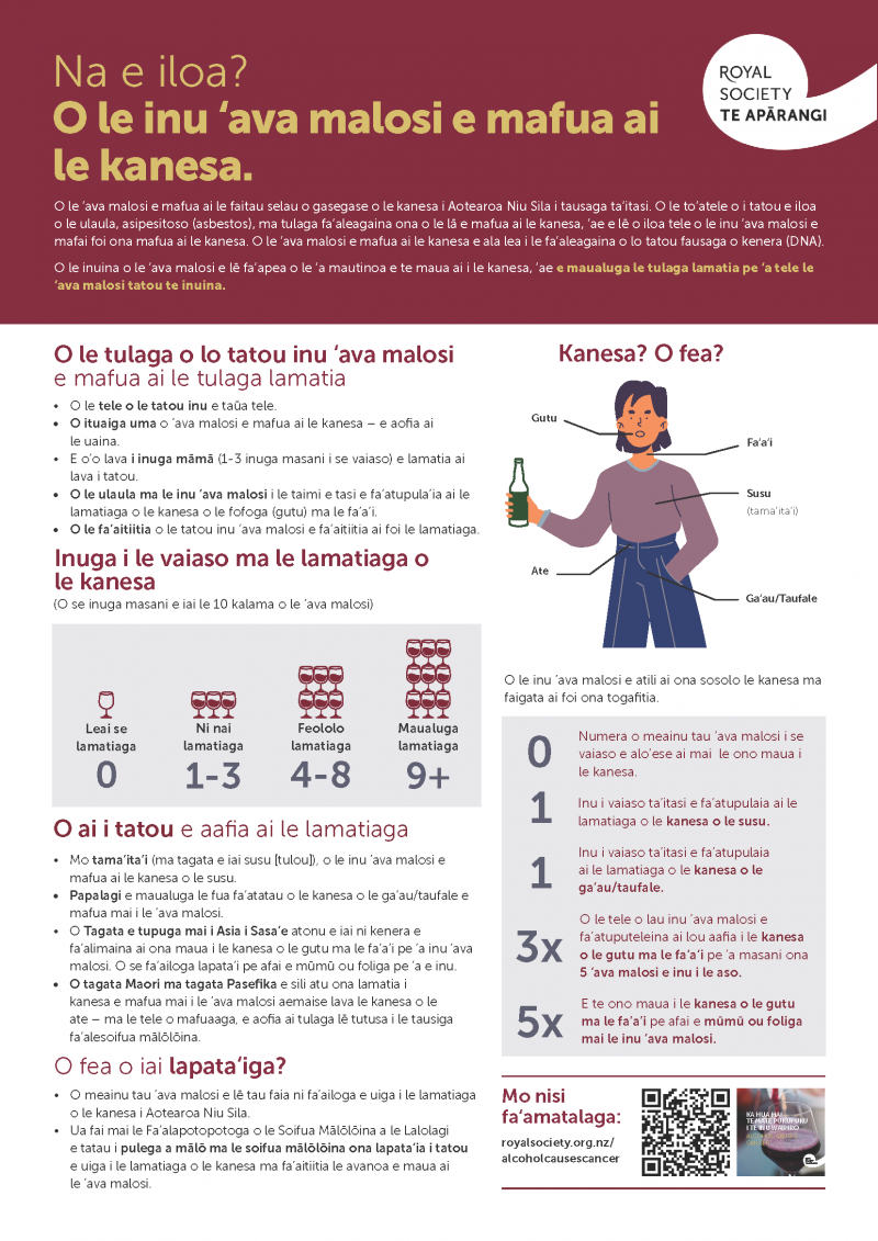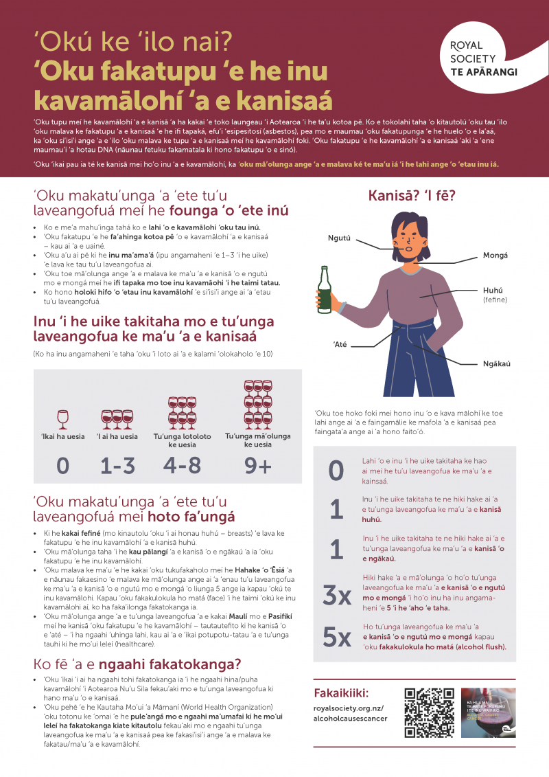 View one-page summaries of the Alcohol Causes Cancer factsheet in English, Te Reo Māori, Samoan and Tongan.