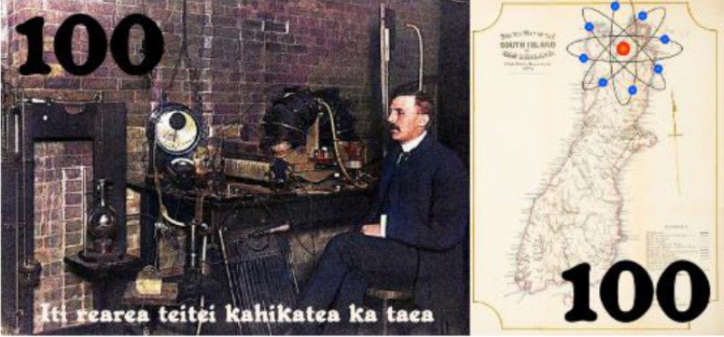 "We added the picture of Lord Rutherford because he is part of the traditional NZ $100 dollar note. We added an atom because Lord Rutherford was the discoverer of the nucleus. We added a dinosaur because his discoveries and theories led to the invention of carbon dating. We added the Māori words because they mean things that Ernest Rutherford is good at. Ngota is atom. Pūngao means energy. Pāngarau means mathematics. We added the picture of the NZ flag because that is where Lord Rutherford was born."