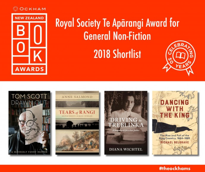 The finalists in the Royal Society Te Apārangi Award for General Non-Fiction category are renowned historian and anthropologist Dame Anne Salmond FRSNZ for Tears of Rangi: Experiments Across Worlds; journalist Diana Wichtel for her debut book Driving to Treblinka: A Long Search for a Lost Father; Massey University Professor of History Michael Belgrave for Dancing with the King: The Rise and Fall of the King Country 1864-1885, and cartoonist Tom Scott for his memoir Drawn Out.