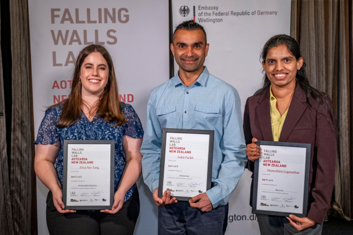 These three winners and two honourable mention recipients were selected from twenty-one participants from around Aotearoa New Zealand and the Pacific Island Nations who pitched their innovative breakthrough ideas at the Falling Walls Lab Aotearoa New Zealand event held by the Royal Society Te Apārangi last week, with support from the German Embassy in Wellington, the Ministry of Business, Innovation and Employment (through the Catalyst Fund) and EURAXESS Australia & New Zealand.