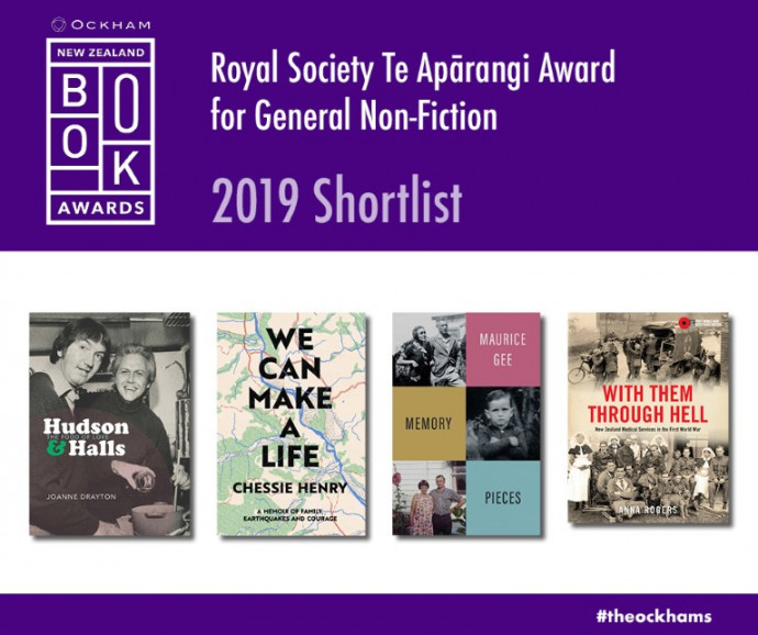 The Royal Society Te Apārangi Award for General Non-Fiction finalists are New York Times best-selling author and academic Joanne Drayton for Hudson & Halls: The Food of Love; lauded and much-loved writer Maurice Gee for Memory Pieces; debut author Chessie Henry for We Can Make A Life, and renowned editor and writer Anna Rogers for With Them Through Hell: New Zealand Medical Services in the First World War.