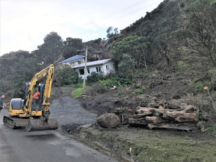 Rainfall-triggered landslides that have displaced houses at Karekare, Auckland. These landslides occurred in weathered Miocene Piha Formation rock and residual soils after Cyclone Gabrielle, February 2023. Image credit: Martin Brook
