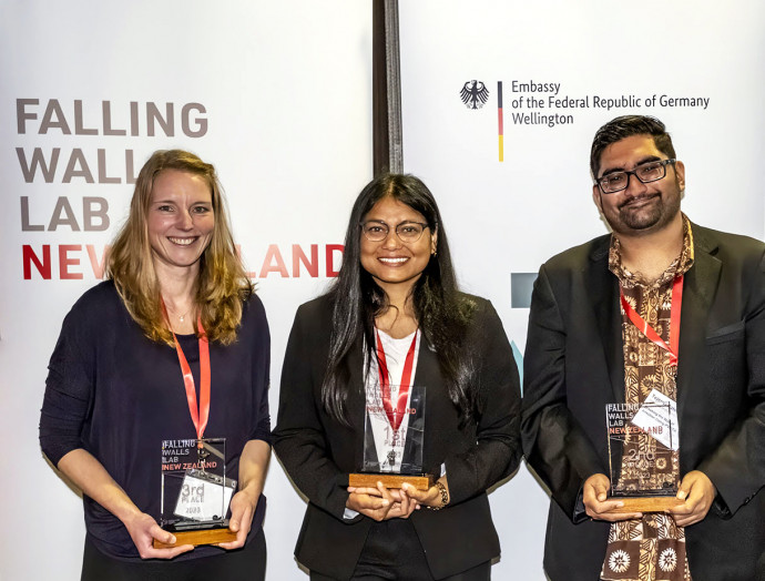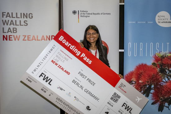 Debashree was selected from twenty-two participants from around Aotearoa New Zealand and the Pacific Island Nations who pitched their innovative breakthrough ideas at the Falling Walls Lab New Zealand event held by Royal Society Te Apārangi this week, with support from the German Embassy in Wellington, the Catalyst: Leaders Fund from the Ministry of Business, Innovation and Employment, and EURAXESS Australia & New Zealand.