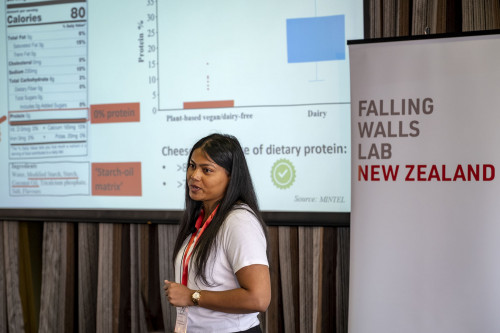 Dr Debashree Roy from the Riddet Institute at Massey University won the Falling Walls Lab Aotearoa New Zealand competition with a breakthrough technology for creating plant-based cheeses that have nutritional and sensory properties like dairy cheeses.