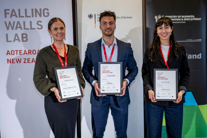 These three winners were selected from nineteen participants from around Aotearoa New Zealand and the Pacific Island Nations who pitched their innovative breakthrough ideas at the Falling Walls Lab Aotearoa New Zealand event held by Royal Society Te Apārangi this week, with support from the German Embassy in Wellington, the Ministry of Business, Innovation and Employment (through the Catalyst Fund) and EURAXESS Australia & New Zealand.