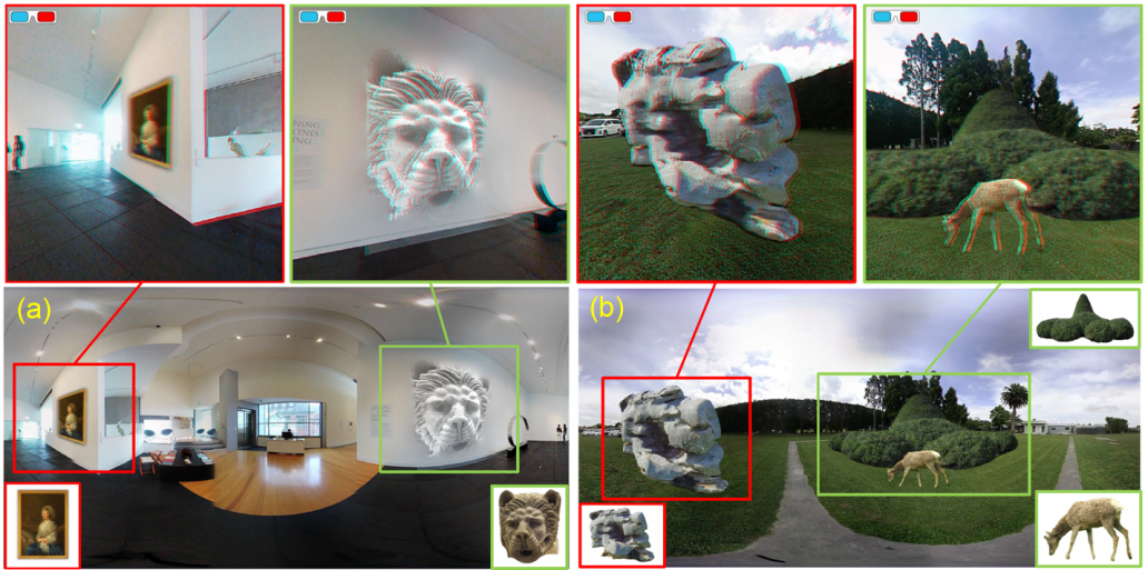 Another challenge for panoramic MR environments is maintaining correct depth perception. “Anaglyphs” are pairs of overlapping images that appear 3D when viewed through specific filters (like the red-blue glasses once used for 3D movies). Unfortunately, this 3D effect breaks down if the anaglyph is viewed from a different angle than intended, breaking immersion when anaglyph objects are added into panoramic MR scenes. Dr Zhang and Professor Dodgson’s team have come up with a view-dependent projection method that improves depth perception of inserted anaglyph objects, making them appear more real within the scene (Figure 2). A short video explainer of this work can be found here.