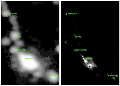 A nice example of the differences between DMSP and VIIRS - in the night skies above the Waikato region. DMSP (older satellite system) and VIIRS (modern satellite system) are on the left and right, respectively. Figure provided by Professor Gibson.