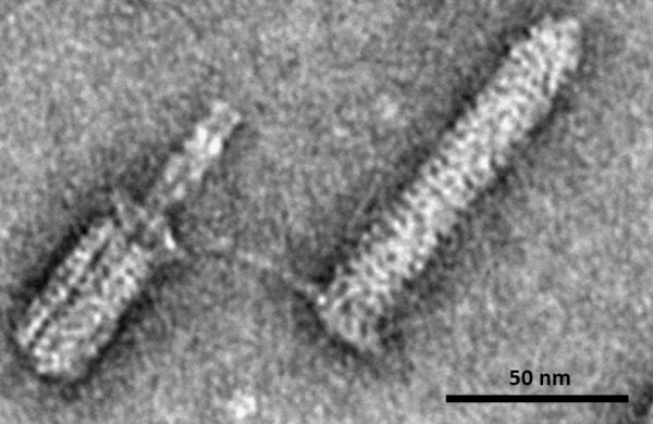 Figure 3: Contracted (left) and extended (right) forms of Afp visualized by negative stain.