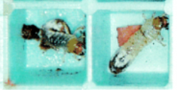 Figure 2: Healthy (left) and diseased (right) larvae after ingesting food laced with virulent Serratia entomophila strain. The diseased larva has an empty gut causing the pale amber appearance.