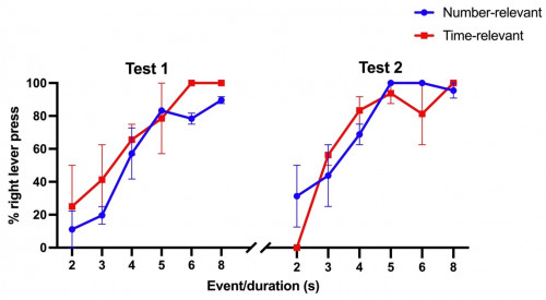The rats were trained to discriminate auditory signals varying in either duration or numbers by pressing the right lever for either longer duration or larger number. Results are expressed as percentage right lever pressing. The red line represents the rats’ performance in response to auditory signals in different durations and as the duration becomes longer, the number of presses on the right lever is greater. The blue line represents the rats’ performance in response to auditory signals in different number and as the number becomes larger, the number of presses on the right lever is greater.