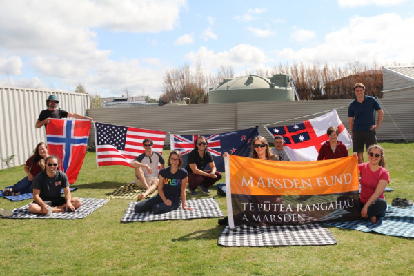 Group photo at the Methven pre-Antarctic isolation facility, 10 October 2021 (after everyone had cleared all their COVID-19 tests).(L-R front): Ben Hurwitz,(Georgia Tech), Frances Bryson (Georgia Tech), Dr Inga Smith (UOO), Maren Richter (UOO). (L-R, second row): Associate Professor Britney Schmidt (Cornell), Brett Grant (NIWA), Dan Dichek (Georgia Tech), Dr Pete Russell (UOO), Dr Enrica Quartini (Cornell), Dr Andy Mullen (Georgia Tech). (Standing with Norwegian flag) Professor Lars Smedsrud (Bergen). Credit: Nicky Burgess
