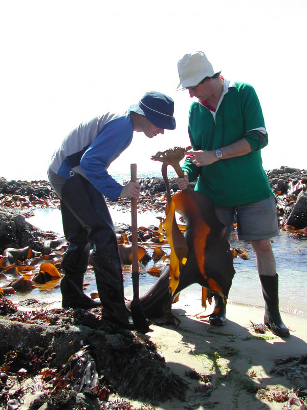 Distinguished Professor Hamish Spencer (right) with collaborator Professor Jon Waters (left) examining the holdfast of rimurapa bull-kelp for small marine invertebrates at Kaka Point, near Iwikatea Balclutha (Supplied).