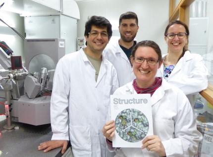 Dr Jodie Johnston with their front cover scientific paper in the journal Structure with (from left to right) her Marsden Grant co-principal investigator Dr Ghader Bashiri; lab manager Ehab Jirgis, whose Masters of Science work formed the basis for the initial work in the Structure paper; and Ms Laura Nigion, who will be funded to work on the Marsden Grant project. Missing are Dr Esther Bulloch, and the University of Canterbury’s Dr Wanting Jiao