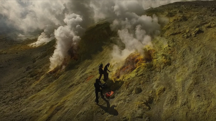 Dr Ian Schipper sampling gases at the sulfur-rich fumarole field of Lastarria Volcano, Chile (Photo: Trail By Fire)