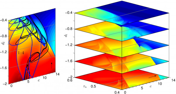 Representation of how delayed feedback loops influence observable behaviour in a model for the El Niño phenomenon; from joint work of Professor Krauskopf with Dr Andrew Keane and Associate Professor Claire Postlethwaite, published in the SIAM Journal on Applied Dynamical Systems