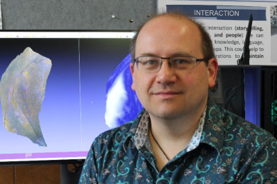 Associate Professor Steven Mills with 3D computer models of stone flakes. Photo Supplied.