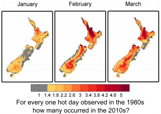 The frequency of unusually hot days increased significantly in Aotearoa between the 1980s and 2010s (image: supplied by Dr Harrington)