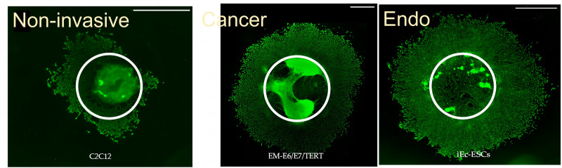 Immunofluorescent images of non-invasive cells (mouse myoblast cell line C2C12), human endometrial cancer cells (EM-E6/E7/TERT), and human ovarian endometriosis cells (iEc-ESCs) showing how endometriosis cells invade further and faster than cancer cells (scale bar = 1 mm; photo: supplied).