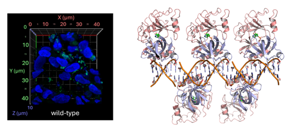 Left: Confocal microscopy image of Neisseria gonorrhoeae bacteria (green) infecting human epithelial cells (blue); Right: Molecules of the Lig E DNA repair protein from Neisseria gonorrhoeae bound to a strand of DNA. This structure was determined using X-ray crystallography (image credits: Jolyn Pan)