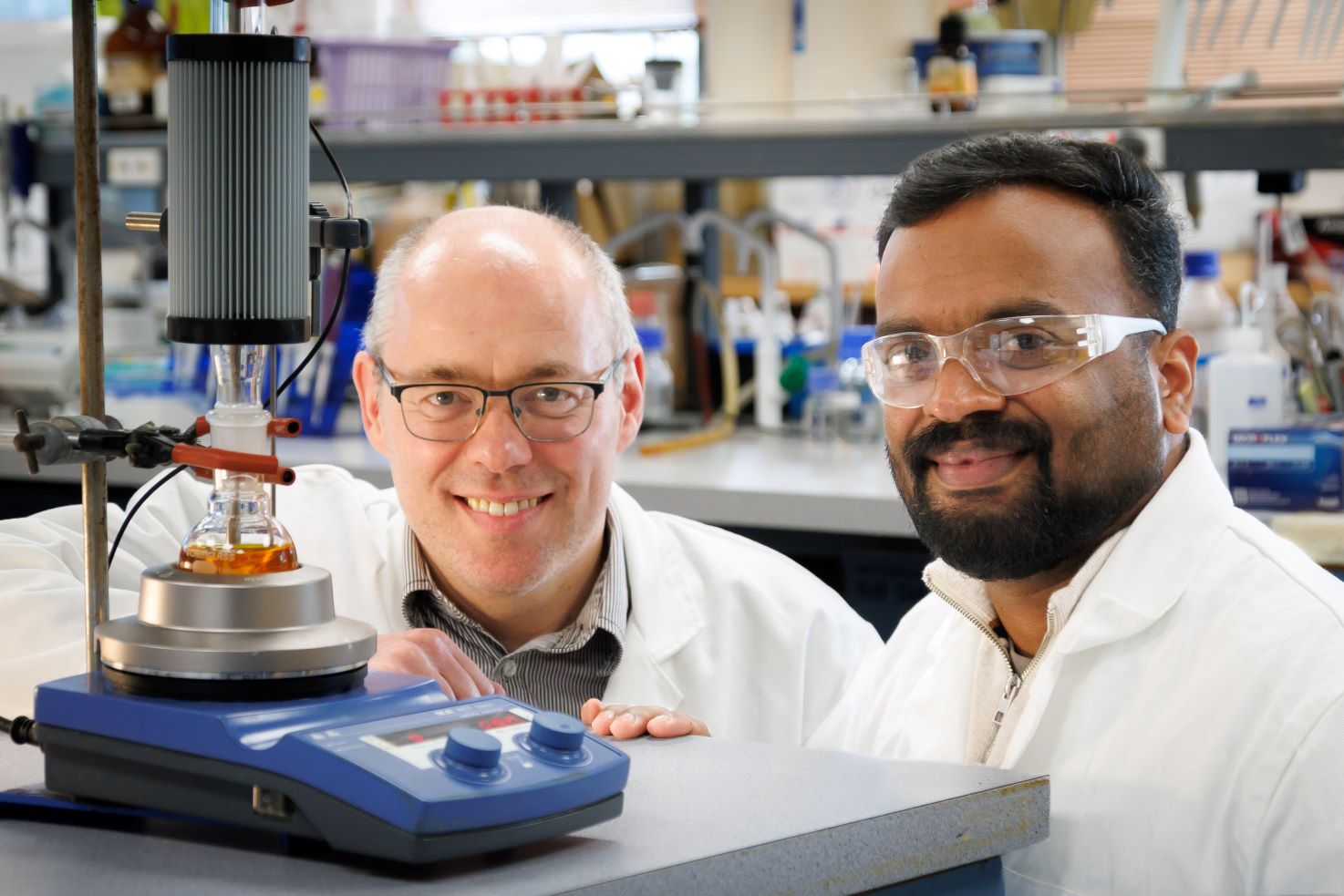 Professor Vyacheslav Filichev (left) and Dr Harikrishnan Kurup (right, post-doctoral fellow) in the chemistry laboratory (photo credit: David Wiltshire, Massey University)