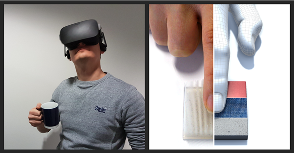 Dr Degraen using a VR device; combining detailed 3D-printed objects with visual information in virtual reality creates realistic material and texture sensations (photo credits: Donald Degraen)