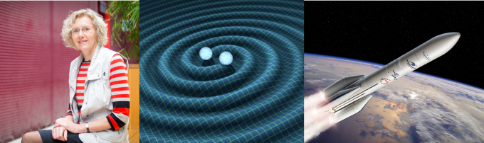 L to R: Professor Renate Meyer, Caltech illustration gravitational waves black hole merger, and ESA-D.Ducros artist impression Ariane 6.