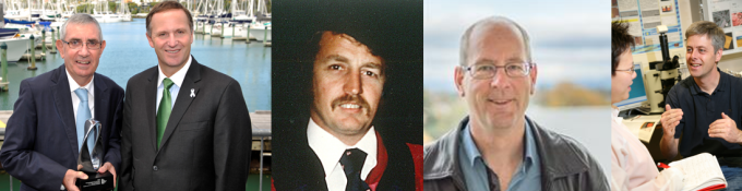 L to R: The late Sir Paul Callaghan with Prime Minister John Key GNZM AC in 2010, the late Professor Dan Walls (image: Dodd-Walls Centre), Professor Simon Brown (image: UOC), Professor Richard Blaikie.
