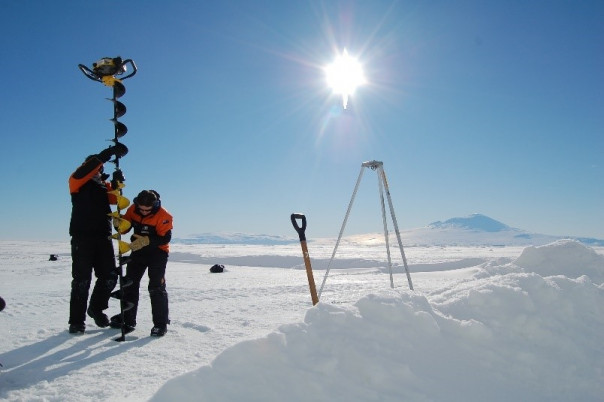 Mike Rowe (Antarctica NZ) and Natalie use a drill to get through ~3 m of sea ice in order to access the supercooled ocean below (Gabby O'Connor)
