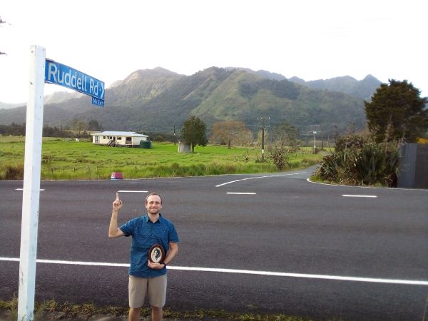 Dr Alexander Trevarton with a photo of his great grandmother, standing under a street sign with his Pākehā great grandfather's family name on it (photo supplied).