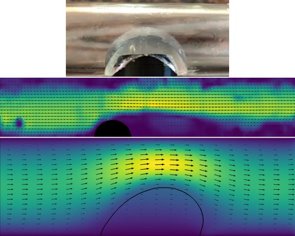 Prototype testing of blood clot analogues in laboratory conditions (top) with flow visualisation of the velocity field using particle image velocimetry (middle), and a close-up of a deformed clot from a numerical simulation (bottom). Flow is from left to right, and the quickest flow is shown in yellow (narrowest region above the clot; image supplied).