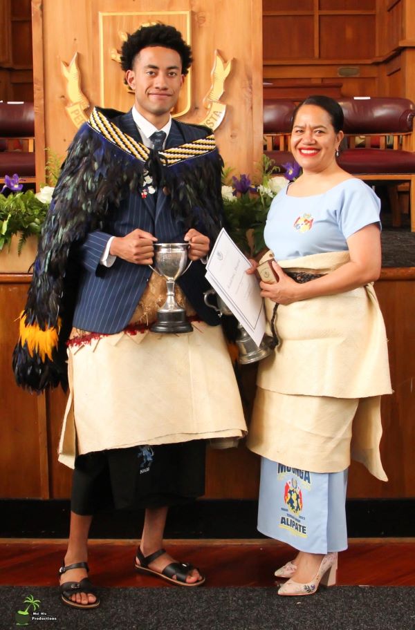 Dr Losa Moata'ane and her son Taiarahia Moata'ane-Mika wearing ta'ovala around their waists woven by her mother. Lālanga is the core of her framework (photo supplied).