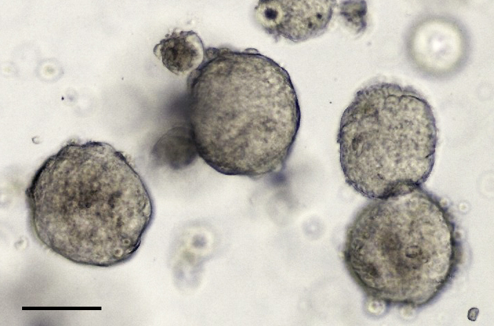 Three-dimensional breast ‘mini-tumours’ grown in the laboratory using tissue donated by a breast cancer patient in Aotearoa. These mini tumours maintain key features of the donor tumour, including tumour structure, growth behaviour and drug response (scale bar = 0.1mm). These models will developed further during this Fellowship, creating a new ‘living library’ of advanced patient-derived breast cancer models. Photo: Supplied.