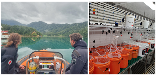 Heading out for a research dive in Duncan Bay. Credit: Nick Hearn; Laboratory enrichment trials set up at the Cawthron Aquaculture Park. Supplied