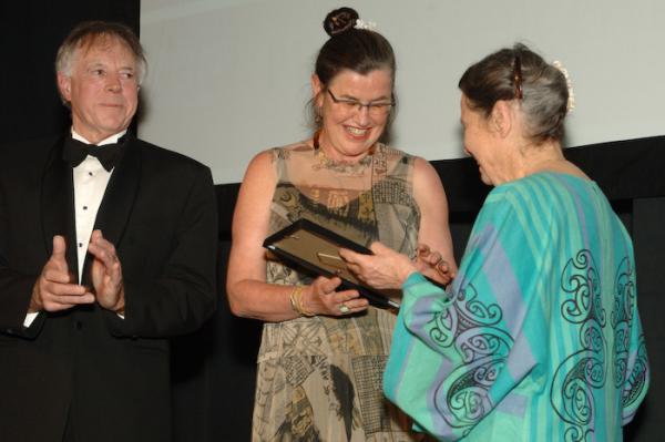 Diana Lennon receives the award from Dame Joan Metge