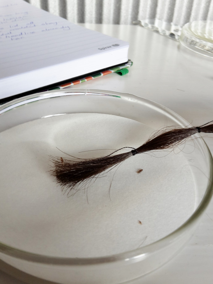 During her time at Hebe Botanicals Nikki researched products currently on the market, looking for the use of essential oils or natural ingredients. Once a list had been compiled of potential effective ingredients, Nikki had to find evidence of their repellency. She did this by looking for scientific studies published in journals and online. Once Steve and Nikki interpreted the data that had been collected, they moved on to creating and testing a possible product. The easiest way to test the product’s effectiveness was to expose live head-lice to human hair, with and without product on it.